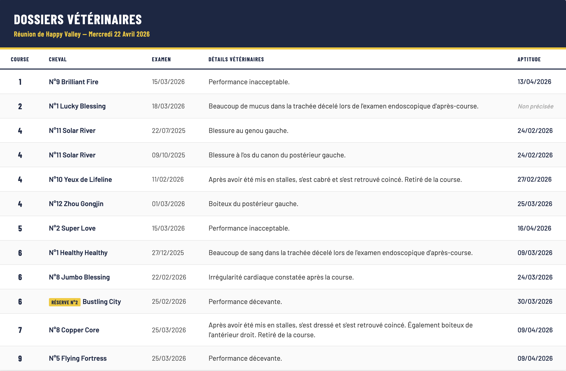 Mercredi 22 avril 2026, Hippodrome de Happy Valley (Hongkong). - Les neuf courses de cette réunion sont supports de paris sur le web exclusivement, à partir de 12h40 pour la R6C1 en France (18h40 sur place).