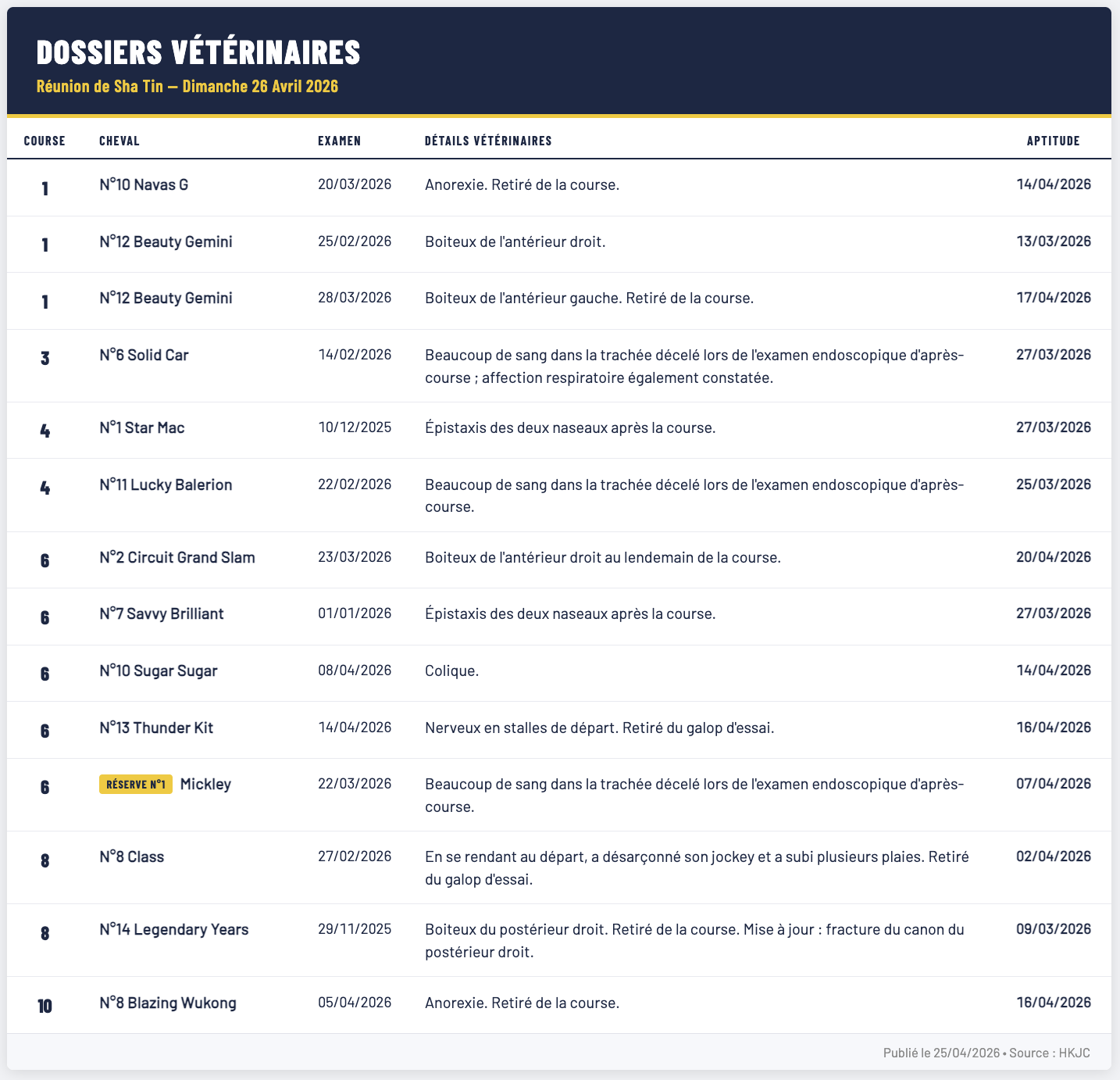 SOLID CAR : Mal parti. A couru avec beaucoup d'allant au milieu du parcours. Son jockey a déclaré que le cheval n'avait peut-être pas tenu les 1 400 m. L'examen vétérinaire a révélé une quantité substantielle de sang dans la trachée (endoscopie) ainsi qu'un trouble respiratoire. Des examens complémentaires n'ont rien révélé de notable. A depuis passé un examen vétérinaire officiel.