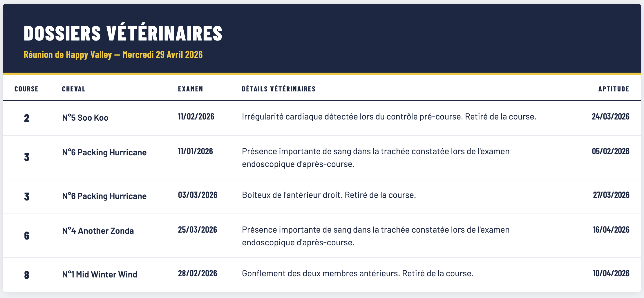 Mercredi 29 avril 2026, Hippodrome de Happy Valley (Hongkong). - Les neuf courses de cette réunion sont supports de paris sur le web exclusivement, à partir de 12h40 pour la R7C1 en France (18h40 sur place).